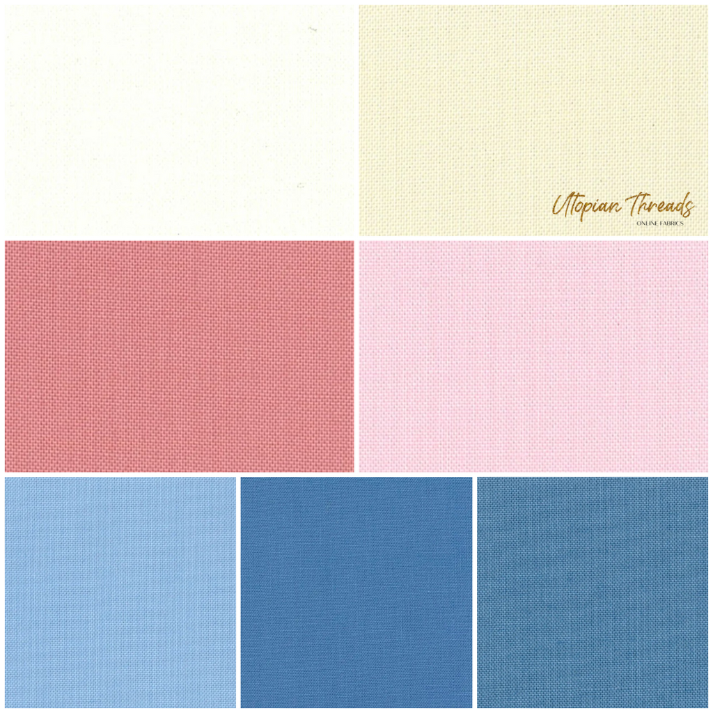 This listing contains a metric Fat Quarter Cut (56cm x 50cm) of each of the 7 Devonstone Solids co-ords pictured above.